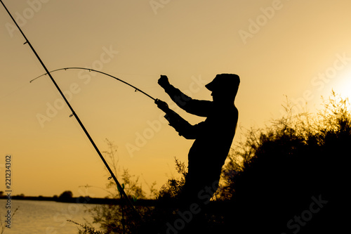 fishing, sunset, fisherman, silhouette, boat, rod, casting, nature, man, person, sky, 1, lake, sport, leisure, activity, recreation, evening, shore, recreational, hobby, reel, summer, caucasian