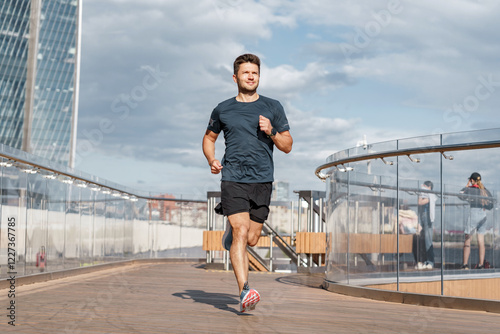 man, jogging, rooftop, urban, exercise, pathway, fitness, sunlight, skyline, running, health, leisure, morning, activity, scenery, fresh air, athletic, sport, landscape, building, city, blue skies, motion, speed, physical exercise, casual clothes, nature, motivation, energy, skyscraper, determination, lifestyle, urban living, wellness, summer day, healthy living