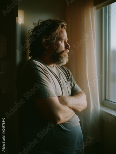 man, window, contemplation, sunlight, afternoon, indoor, quiet, observation, peaceful, thoughtful, bearded, pose, leaning, daydreaming, light, home, serene, mood, male, room, decor, stillness, expression, nature, view, relaxation, solitude, casual attire, looking, leisure, moment, emotion, lifestyle, calmness, scenery, face, pensive, quietness, soft, surrounding, interior, setting, body, language, warmth, environment, day, horizon, reflections