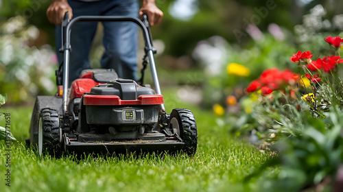 lawn mower, grass, gardening, mowing, lawn, garden, summer, green, red, black, man, person, machine, tool, equipment, landscaping, yard, work, spring, maintenance, home, property, care, activity, hobby, lifestyle, leisure, flowerbed, flower, plant, bloom, blossom, nature, environment, cutting, wheel, engine