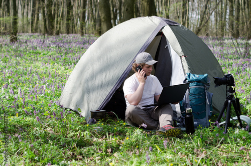 active, adult, adventure, backpacking, business, camp, camper, camping, caucasian, communication, computer, connection, grass, green, hike, hiking, cyberspace, laptop, leisure, man, meadow, mobile, mountain, natural, nature, notebook, office, people, person, portable, programmer, camera, screen, success, tent, typing, wireless, work, write, male, day, exterior, sunny, photographer, spring, summer