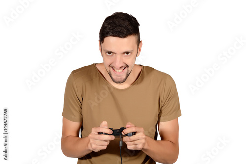 man, white, young, game, video, play, video game, console, fun, person, controller, happy, 1, technology, joystick, caucasian, hand, male, expression, computer, holding, entertainment, casual attire, background, gaming, control, guy, isolated, leisure, joy, lifestyle, enjoying, playing, concentration, looking, activity, gamer, enjoyment, having, people, remote, portrait, closeup, model, finger, addiction