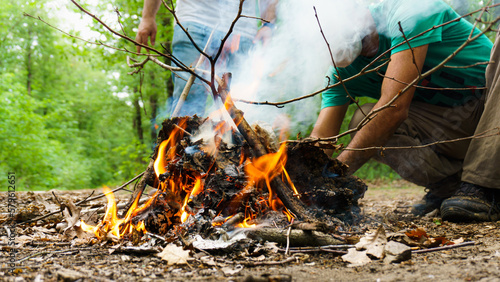 Man preparing barbecue fire for cooking meats at mountain forest camp. Fire flames and smokes of a bbq fire on beautiful forest background.