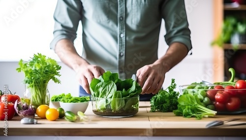 man, adult, salad, kitchen, preparation, nourishment, vegetable, vegetarian, healthy, food, diet, cooking, green, organic, dinner, eating, table, meal, lunch, breakfast, hand, fresh, tomatoes, lettuce, herb, knife, chopping board, wood, indoor, day, 1, people, lifestyle