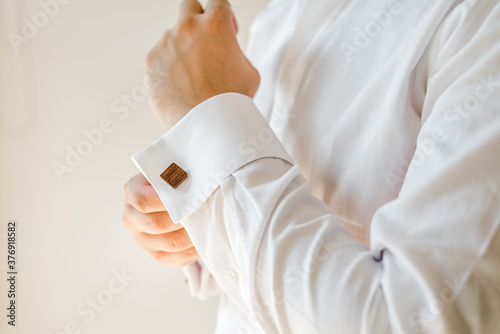 Man putting on a white shirt and cufflinks. Preparation. Formal wear.