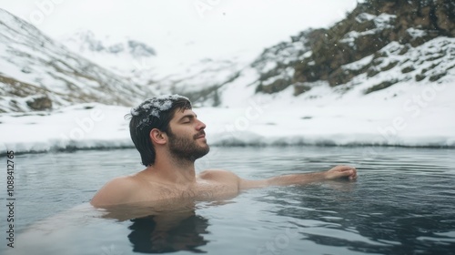 Man relaxing in a geothermal hot spring surrounded by snow
