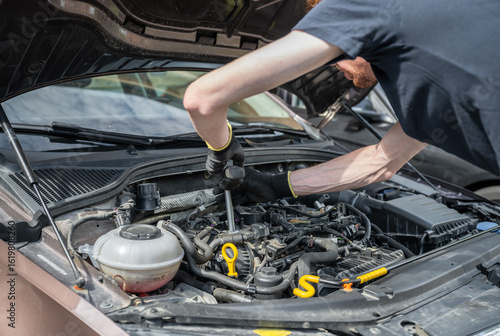 Man repairing car engine in residential outdoor parking area on a sunny summer day
