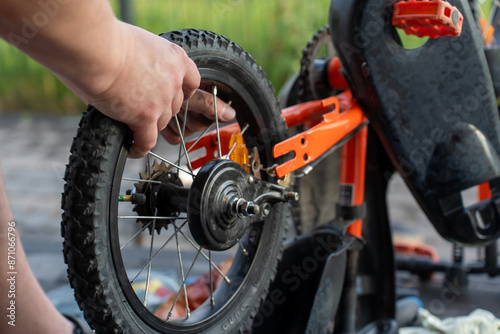 Man repairs a small children's bicycle in a home workshop. Close-up. Unscrews the nuts and starts repairing. High quality photo