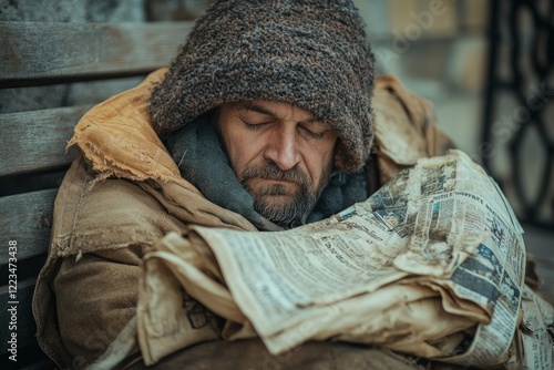 man, sleeping, bench, newspaper, outdoors, resting, winter, cold, coat, hat, urban, city, solitude, sleepy, peaceful, street, homeless, shelter, warmth, reading, poverty, loneliness, public, park, quiet, serene, calm, lifestyle, daily, life, survival