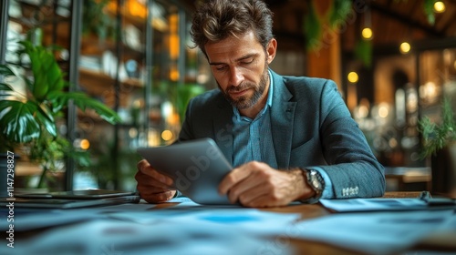 man, document, workspace, analysis, sharpened, business, plant, table, technology, professional, reading, strategy, office, concentration, paper, idea, research, planning, work, environment, casual attire, attire, interaction, design, creativity, communication, collaboration, project, presentation, information, laptop, notebook, datum, team, meeting, hot drink, discussion, light, space, background, modern, aesthetic, inspiration, growth, productivity, detail