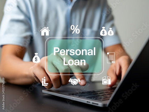 Man s hands interacting with a digital interface displaying personal loan options and financial icons on a laptop
