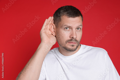 acoustic, acoustical, adult, audio, auditory, earing, background, caucasian, communication, curiosity, ear, eardrum, eavesdrop, funny, gesture, gossip, hand, hear, hearing, interesting, listen, listening, louder, male, man, model, nosey, person, portrait, privacy, red, rumour, secrecy, secret, sensory, showing, sound, spy, volume