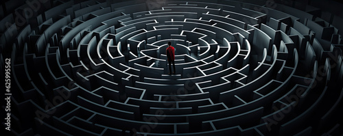 Man silhouette in maze or labyrinth. Finding solution and self concept