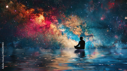 Man silhouette, meditation under stars, full moon, milky way, universe. Man silhouette in water, practicing meditation,