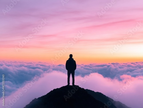 silhouette, man, mountain, peak, sky, cloud, sunrise, sunset, landscape, person, standing, alone, nature, view, adventure, travel, hike, achievement, success, inspiration, freedom, peace, calm, serenity, hope, courage, strength, solitude, journey, exploration