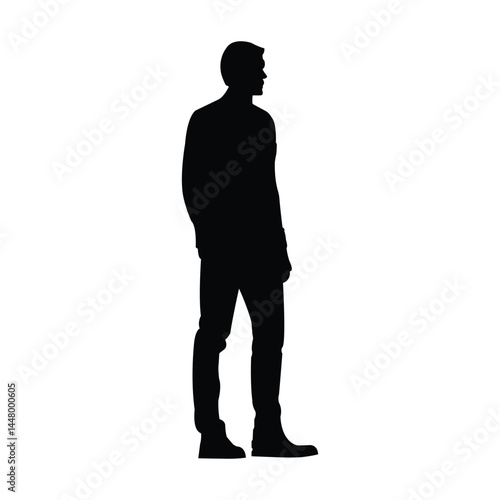 silhouette, man, standing, male, person, human, figure, profile, pose, posture, full-length, black, simple, design, element, illustration, graphic, vector, artwork, shadow, shape, outline, isolated, background, template, abstract, style, minimal, modern, contemporary, symbolic, representation, individual, body, casual attire, clothes, pant, shoe, leg, arm, head, concept, symbol, icon, image, cut-out, fashion