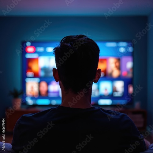 man, television, watching, screen, streaming, service, entertainment, home, content, display, media, technology, lifestyle, rear, back, person, adult, male, casual attire, attire, dark, night, indoor, digital, modern, leisure, relaxation, hobby, anonymous, contemporary, solitude, couch, sofa, sitting, seated, viewing, motion picture, series, show, online, cyberspace, connected, device, electronic, domestic, living room, bedchamber, pastime, solo