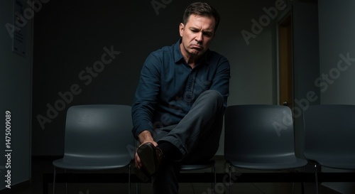 Man sitting alone in a waiting room, reflecting on his thoughts in a dimly lit space