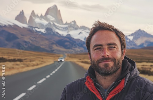man, male, person, portrait, face, smile, happy, mountain, landscape, scenic, road, highway, travel, journey, adventure, explorer, outdoors, nature, view, background, patagonia, argentine, peak, summit, snow, ice, rock, sky, cloud, horizon, distant, car, vehicle, driving, trip, exploration, freedom, wild, open, huge, cold, windy, altitude