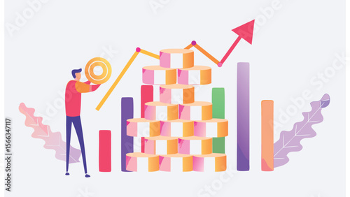 man, coin, stack, arrow, bar chart, financial, growth, investment, success, business, economy, finance, wealth, money, increase, profit, earning, revenue, market, trend, diagram, chart, graph, statistic, datum