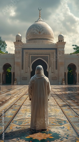 mosque, man, architecture, dome, minaret, islamic, culture, rear, view, prayer, spirituality, worship, entrance, traditional, design, poster, postcard, wallpaper, greeting, card, invitation, sky, cloudy, courtyard, tile, path, landscape, religion, building, exterior, structure, faith, heritage, travel, holiday maker, destination, landmark, historical, sacred, pilgrimage, holy, place, serenity, peaceful, calmness, scene