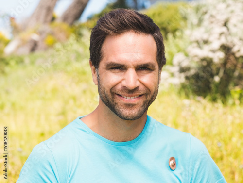 people, man, meadow, sunlit, smiling, turquoise, tee, portrait, nature, outdoors, casual attire, vibrant, serenity, harmony, white, male, standing, camera, green, grass, wildflower, shrub, tree, blue skies, short hair, beard, bright, sunlight, natural, park, field, relaxed, sharpened, fresh, peaceful, soft, blur, environment, upper body, happy, daytime, spring, summer, calm, healthy, leisure, scenic, tranquil