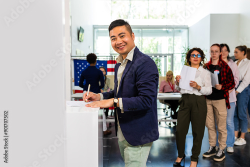 Man standing in voting booth, voting. Concept of USA elections, patriotism, support