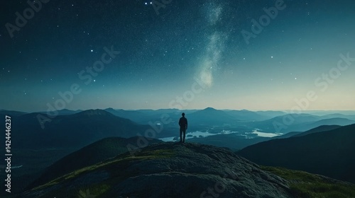 man, standing, observing, silhouette, mountain, night, star, sky, milky way, landscape, scenic, travel, adventure, rural, exploration, dark, altitude, lake, distant, vista, ridge, view, evening, twilight, terrain, peak, hill, high, tour tourism, summer, vacation, natural, wilderness, recreation, destination, remote, serene, quiet, atmospheric