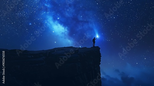 Man stands alone on the edge of a cliff, with the stunning backdrop of the Milky Way galaxy, lit by twinkling stars. capturing a sense of wonder and awe at the vastness of the cosmos.