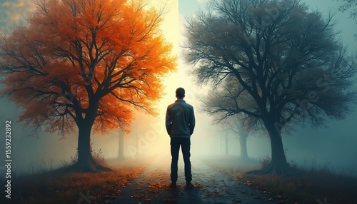 Man stands on path between two trees, one with orange leaves, with grey leaves. Autumn season, concept about mental health, choices, duality, life path, emotions, decision, philosophy, self