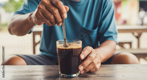 Man Stirring Coffee Outdoors: Casual Lifestyle and Morning Ritual