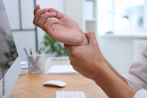 Man suffering from pain in wrist while working on computer at table indoors, closeup. Carpal tunnel syndrome