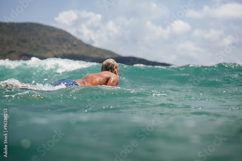 man swim surf in the sea back view with blue sky