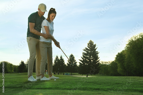 green, sunny, background, hobby, nature, day, outdoors, adult, park, field, grass, lifestyle, recreation, game, playing, equipment, play, professional, sport, training, activity, player, course, golf, golfer, caucasian, happy, smiling, spring, fairway, woman, female, love, male, man, people, couple, helping, teaching, landscape, ball, club, space, copy, text, hitting, boyfriend, girlfriend, accuracy