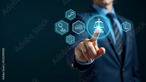 Man touches holographic icons of justice AI copyright and regulations on digital interface symbolizing intersection of law and artificial intelligence in empty space concept as Man touches holographic