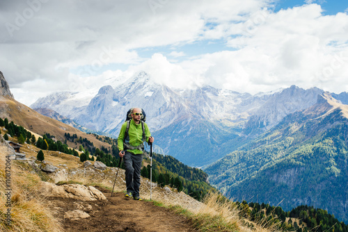 Man tourist with a backpack walking mountain trails in the Dolomite, Alps