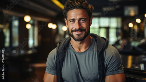 Man trainer smiling at fitness gym abstract background. Generative ai.