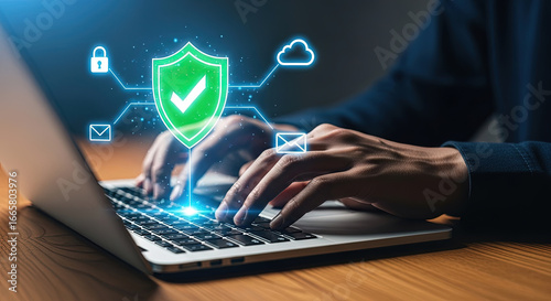 network, connection, cyberspace, man, typing, laptop, shield, protection, safety, lock, electronic mail, secure, computing, encryption, firewall, authentication, access, authorisation, virus, threat, communication, datum, innovation, information, risk, management, user, identity, verification, confidentiality, privacy