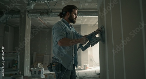 man, sanding, drywall, tool, using, construction, men at work, interior, dusty, bearded, equipment, repair, renovation, building, wall, uniform, engineer, workspace, maintenance, improvement, male, contractor, industry, indoor, industrial, development, site, sandpaper, grit, surface, polishing, preparation, project, trade, skill, expertise, job, labor