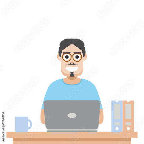 man, using, laptop, for, work, from, home, wear, t-shirt