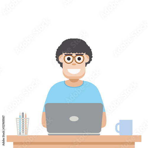 man, using, laptop, for, work, from, home, wear, t-shirt