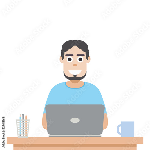 man, using, laptop, for, work, from, home, wear, t-shirt