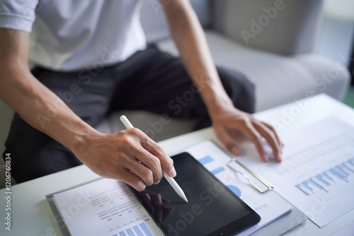 Man using tablet and pen for work or education, He siting on sofa in living room