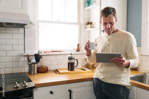 man, leaning, home, sunlight, morning, technology, window, connection, hot drink, standing, drink, casual clothes, concentration, tablet, lifestyle, communication, domestic life, ipad, refreshment, mobile phone, reading, kitchen, phone, holding, mobile phone, stubble field, avocation, cup, looking, front view, window light, modern, wireless technology, oregon, brunette, portland, indoor, day, one person, mature adult, male