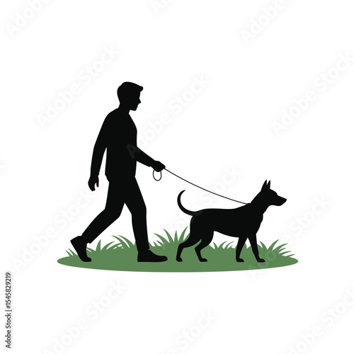 man, dog, walking, silhouette, black, green, grass, park, pet, leash, canino, nature, animal, person, simple, minimalist, vector, graphic, logotype, icon, illustration, design element, companionship, friendship, loyalty