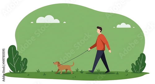 man, walking, dog, leash, park, illustration, grass, tree, cloud, person, animal, outdoors, pet, companion, green, sky, field, cartoon, style, simple, minimalist, scene, day, activity, design, concept, recreation, leisure, lifestyle, flat, art, drawing, exercise, nature, background, friendship, domestic, vector, plant, artwork, graphic, image, male, character, 1, distance, togetherness