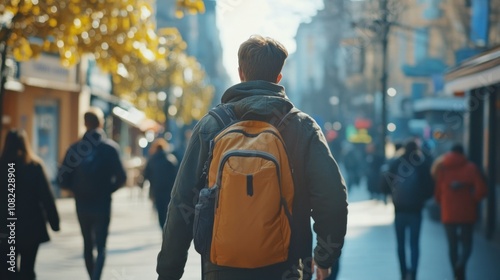 man, backpack, walking, street, urban, daylight, people, city, casual attire, front view, outdoors, nature, tree, autumn, crowd, sunlight, lens flare, leisure, lifestyle, urban life, journey, exploration, travel, adventure, scenery, motion, environment, architecture, shopping, road, pedestrian, movement, relaxation, ground, half face, background, colours, active, destination, life events, urban scene, vibrant, wander, solitude, wanderlust