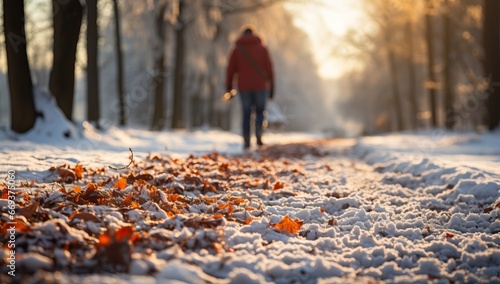 man, adult, red, coat, snow, forest, winter, cold, nature, outdoors, day, 1, people, lifestyle, orange, season, sunlight, colours, light, bright, beauty