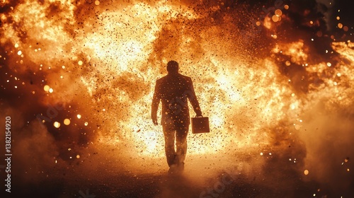 fire, man, walking, flames, explosion, businessman, briefcase, smoke, dark, light, heat, silhouette, dramatic, powerful, courage, strength, survival, overcoming, challenge, adversity, success, path, journey, forward, determination, ambition, leadership, business, career, risk, danger, passion, intense, blazing, inferno, hot, blaze, surreal, abstract, artistic, image, photo, modern, contemporary, surrealism, vibrant, colours, bold, energy