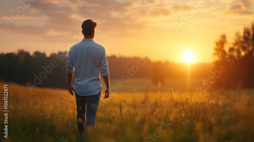 man walks through serene field at sunset, surrounded by tall grass and wildflowers. warm glow of sun creates peaceful atmosphere, evoking sense of tranquility and reflection.